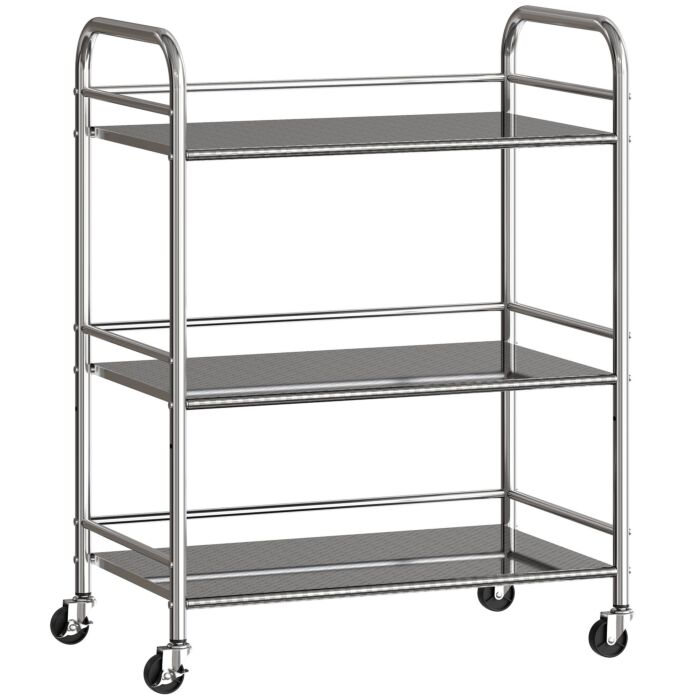 Struggling with cluttered kitchen spaces and items that just don't fit? Our 3-tier storage trolley from HOMCOM offers the great solution. The middle shelf is adjustable to accommodate any kitchenware or appliance. Glide this versatile serving trolley smoothly between rooms, then securely lock it in place for stability. Built with robust 201 stainless steel, the rolling cart resists corrosion and scratches, ensuring lasting durability and a more organised, serene home setting.