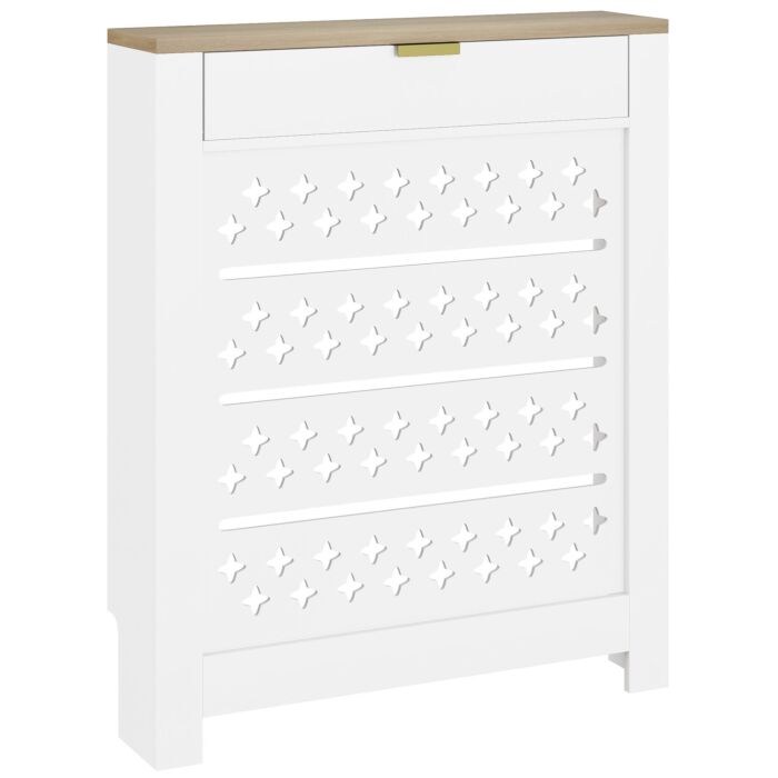 Safety ensured around radiators with this HOMCOM protective cover. Made from a particle board and MDF blend, this is a reliable piece made for everyday use; it comes in a white body with a wood-effect for a simple design which looks great in plenty of different interior styles. The front cross cut-outs ensure heat can escape from the cover - so you can actually feel your radiator and keep warm as normal. It's complete with a top drawer for discreet storage.