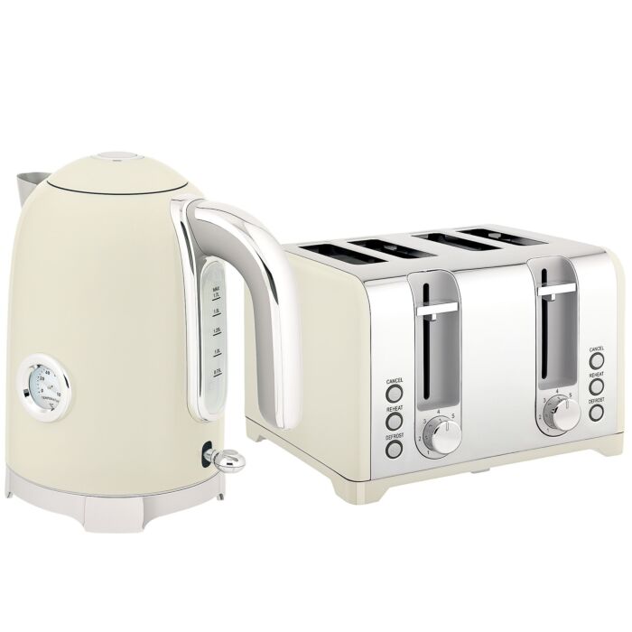 Time to make a statement on your countertop, with this HOMCOM kettle and toaster set. A retro-inspired design, it blends together a block colour with silver-tone accents, in a smooth curved shape. The set comes with a 3000W rapid boil kettle and four-slice toaster: everything you need for that brew and toast - morning and evening. And thanks to the wide 3.5 cm slots on the toaster, it even fits delicious thick bread.