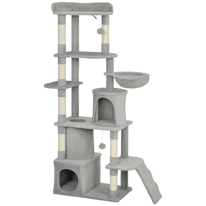 Pawhut 170 Cm Large Cat Tree, Cat Tower With 7 Scratching Posts, Tunnel, 2 Condos, Hammock, Perch, Ramp, Pompoms, Light Grey