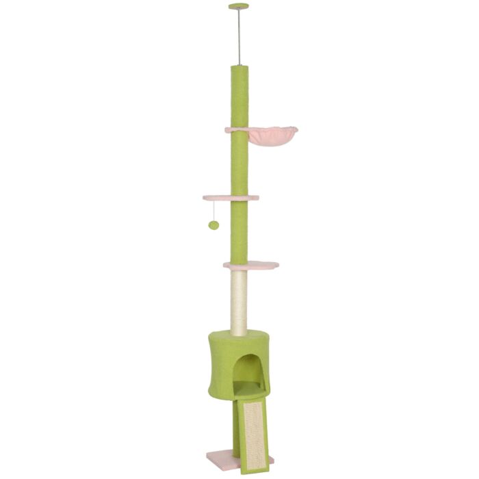 Pawhut 220-240 Cm Floor To Ceiling Cat Tree Adjustable Height With Hammock, Condo, Scratching Posts, Green